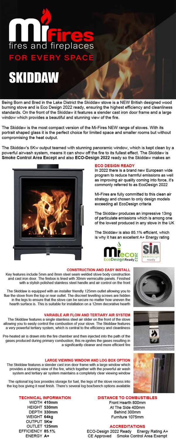 The Skiddaw Woodburning Stove offer a comfortable 5kW of heat out put to room perfect for small to medium sized rooms. Offering a highly efficiency 85% (A+ rated) and clean burn producing 13mg of particulate emissions. The Skiddaw Stove is Defra Approved make it suitable for burning wood in Smoke Exempt areas.